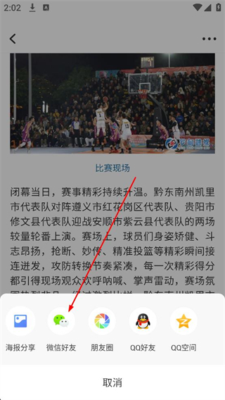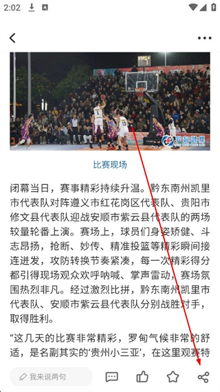 3、在資訊詳情頁閱讀比賽相關內容,查看配圖信息,確認內容后找到分享按鈕并點擊,彈出分享選項窗口。