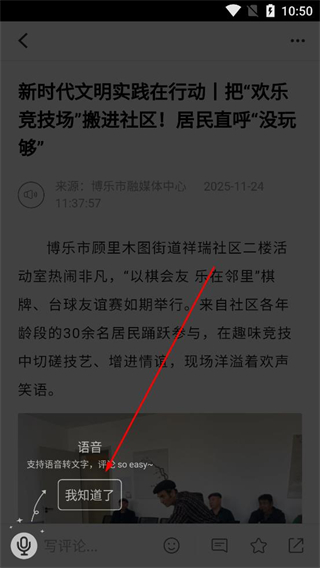 2、在資訊詳情頁中瀏覽活動介紹信息,若彈出語音提示彈窗,點擊我知道了按鈕關閉彈窗,繼續查看活動的具體開展情況與參與人員等內容。