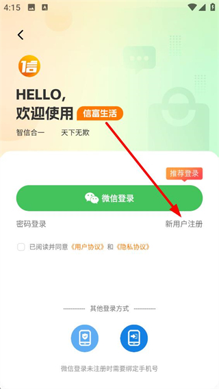 3、進入登錄界面,可選擇微信登錄密碼登錄等方式,也可點擊新用戶注冊按鈕,完成賬號注冊流程,登錄前需勾選用戶協議和隱私協議。