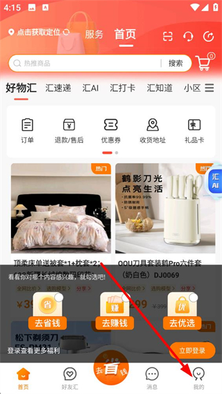 1、進入應用首頁,可瀏覽好物匯等板塊的商品,使用訂單退款、售后等功能入口,點擊底部我的選項,可進入個人中心頁面查看資產等信息。