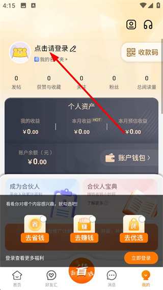 2、個人中心頁面,顯示未登錄狀態,點擊請登錄按鈕可進入登錄界面,同時能查看發帖獲贊等數據,以及個人資產相關的收益信息。