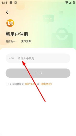 4、進入新用戶注冊頁面,先對應輸入框填寫手機號,勾選已閱讀并同意相關協議后,點擊下一步即可推進注冊流程,完成賬號創建。
