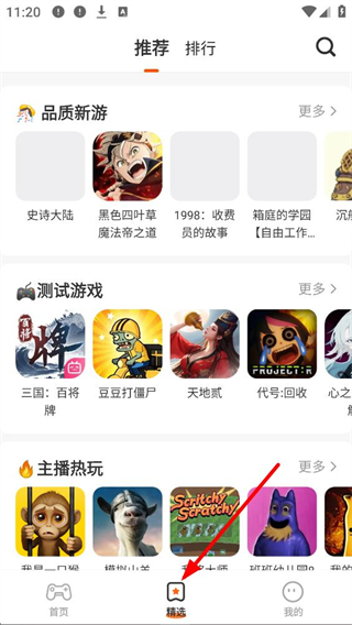 4、進入精選界面,可查看推薦和排行的游戲,瀏覽品質新游、測試游戲、主播熱玩等分類游戲,如黑色四葉草等。
