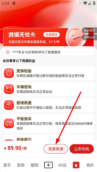 2、進入救援界面,能查看救援無憂卡信息及更換輪胎、車輛搭電等會員救援權益,點擊我要救援按鈕,進入救援信息填寫界面。