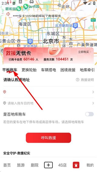 3、進入救援信息界面,可選擇平板拖車等救援類型,需確認救援地址、輸入拖車目的地,還能選擇是否地庫拖車,準備呼叫救援。