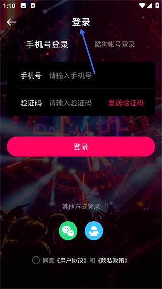 1、登錄頁提供手機號、酷狗賬號及第三方平臺登錄方式,需填寫信息并同意協議,是賬號登錄的操作界面。