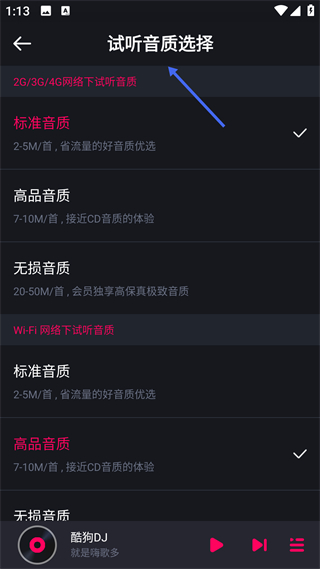 3、試聽音質選擇頁分不同網絡環境設置音質,含標準、高品、無損選項,是調整音樂試聽品質的界面。