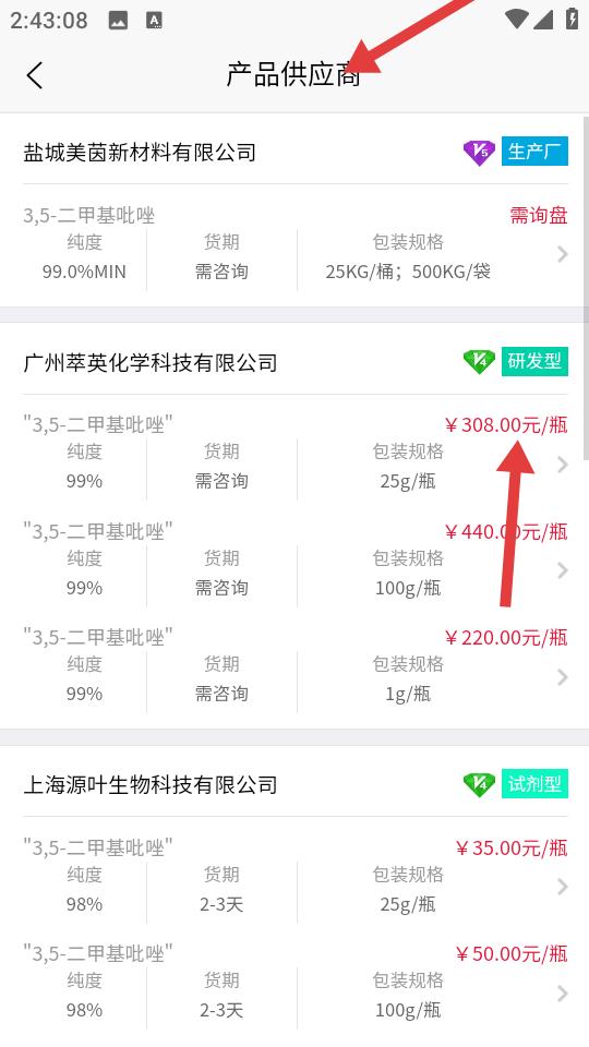 3、產品供應商界面羅列二甲基吡唑的供應廠家,不同商家標注純度、貨期、包裝規格及價格,如廣州萃英308元一瓶,幫助用戶對比選購。