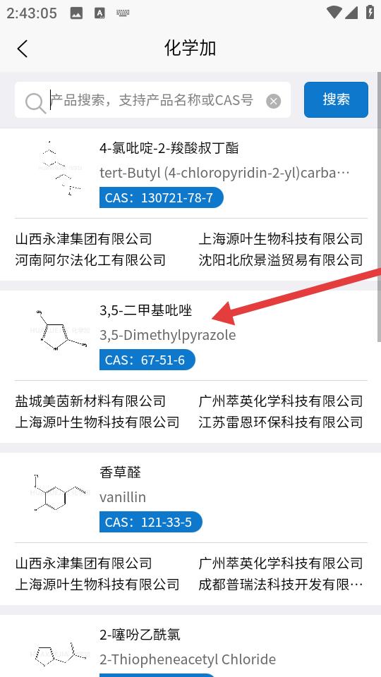 2、產品搜索頁展示多種化合物35二甲基吡唑條目清晰,標注CAS號下方列多家供應商,方便用戶查看該化合物的供應信息。