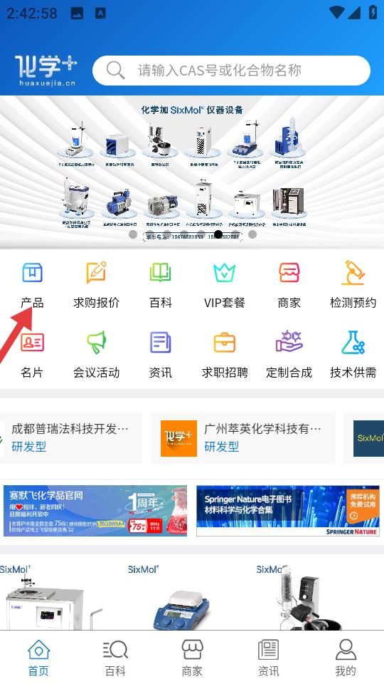 1、首頁布局清晰頂部搜索框支持CAS號或化合物名稱查詢,中間陳列儀器設備圖示,下方產品等功能圖標醒目點擊助力用戶快速進入產品查找環節。