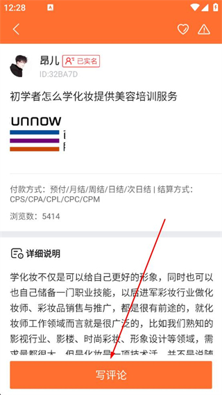 4、在服務詳情頁查看付款結算方式、瀏覽詳細說明,了解服務內容,也可點擊寫評論按鈕參與互動。