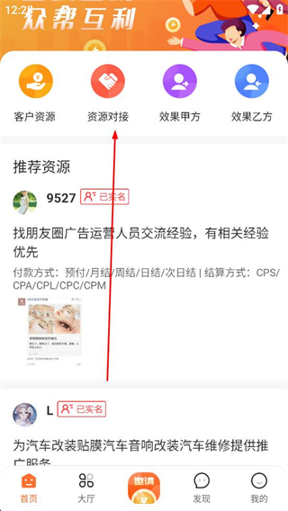 2、登錄后切換至大廳板塊選擇資源對接選項,進入資源對接頁面,瀏覽各類服務信息列表。