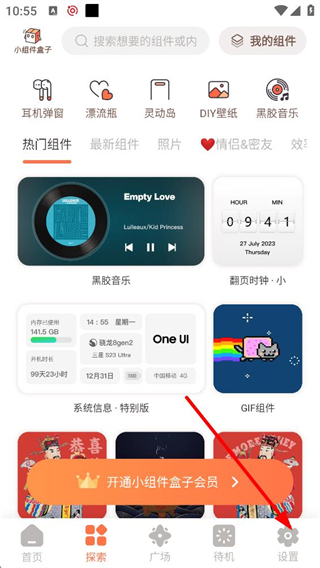 1、進入組件盒子的探索頁面,頂部設搜索欄及耳機彈窗等功能入口,下方展示黑膠音樂等熱門組件,點擊底部設置按鈕,可進入對應的我的頁面開展操作。