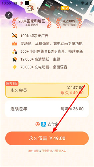 3、點擊開通會員進入會員頁面,展示出純凈無廣告等會員專屬權益,還有限時折扣的會員套餐,點擊底部對應按鈕即可參與會員購買流程。