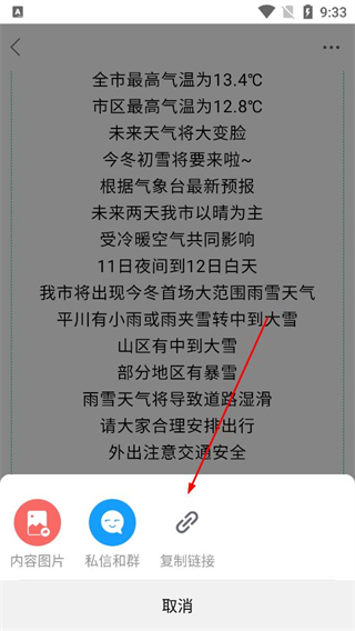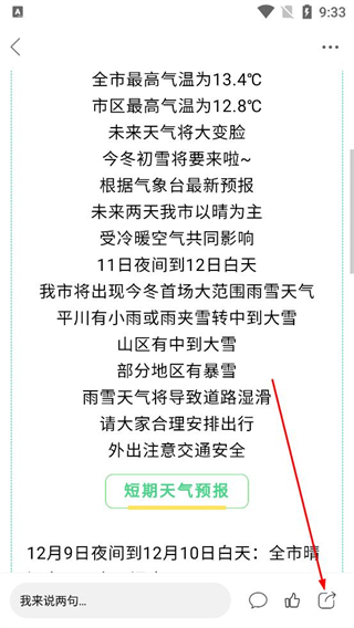 3、在天氣詳情頁閱讀氣溫及天氣變化預報內容,了解雨雪天氣的影響區域及出行提示,點擊分享按鈕。