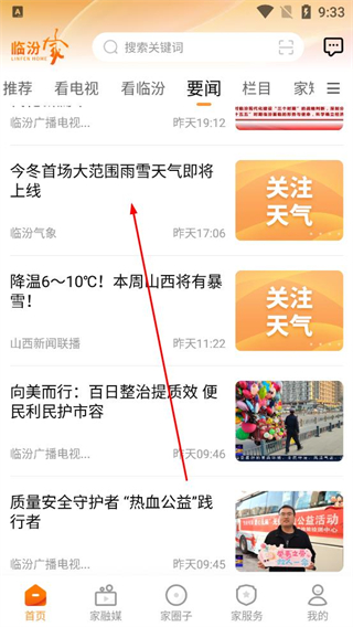 2、登錄后進入首頁瀏覽推薦板塊內容,找到全省首場大范圍雨雪天氣資訊,點擊該資訊,進入對應的天氣詳情頁面。