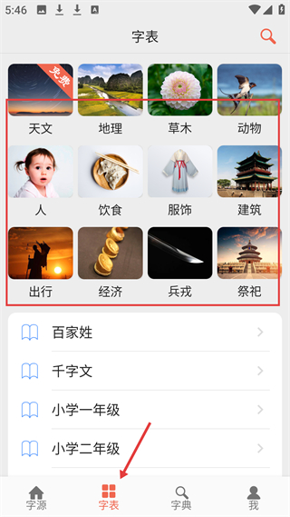 1、字表頁,按天文、地理等生活類別分類漢字,可學百家姓、千字文、及小學漢字,是漢字分類學習入口。