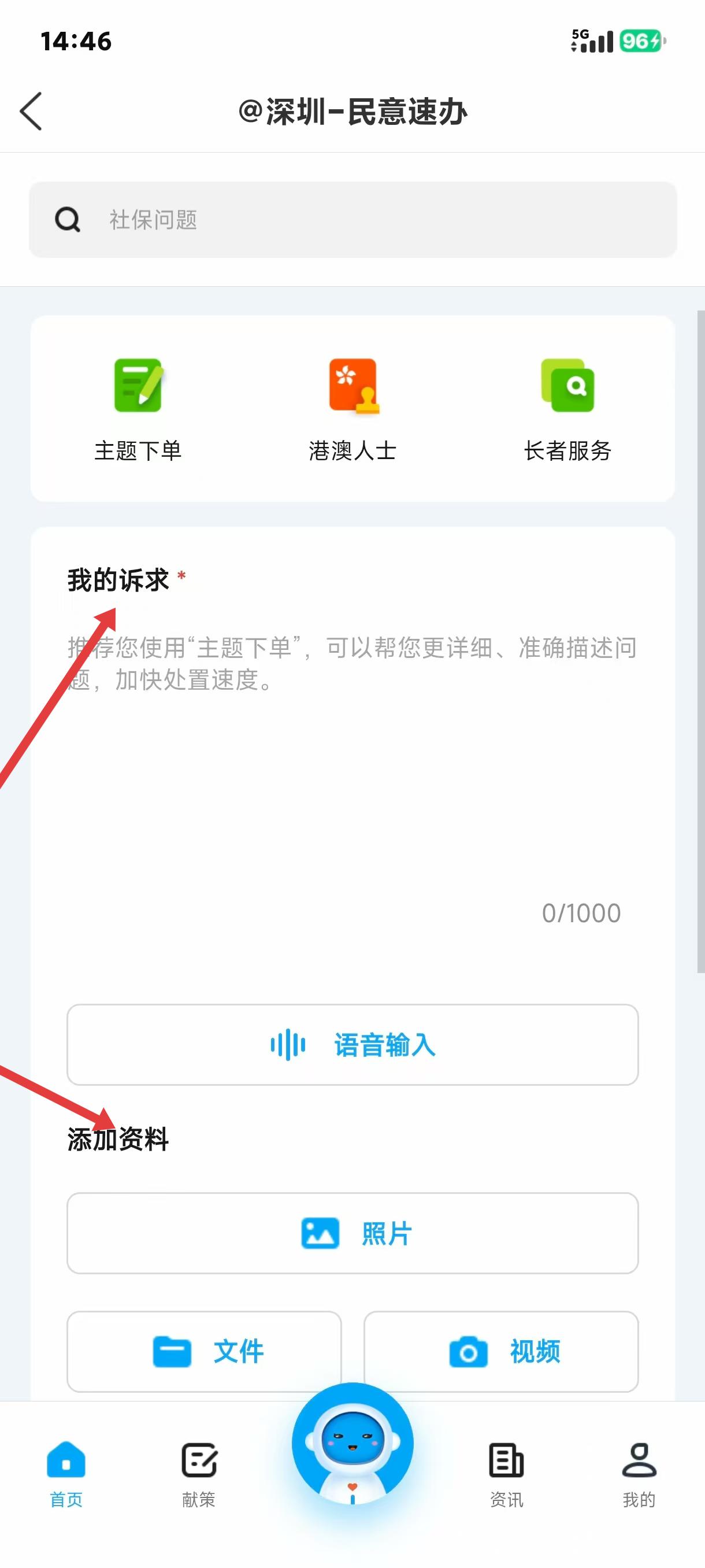 3、訴求填寫頁設計實用搜索欄輔助,主題下單等分類便捷,我的訴求欄支持文字語音輸入,添加資料可傳照片文件視頻,助力市民市民精準提交。