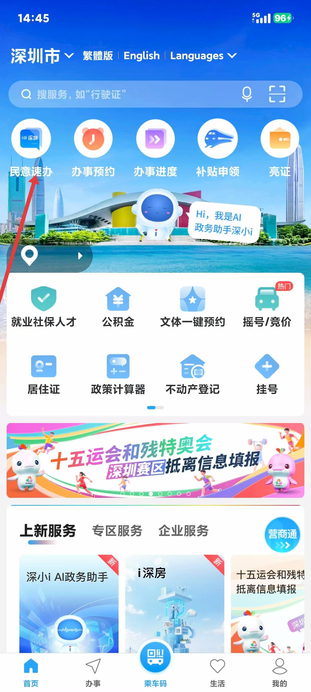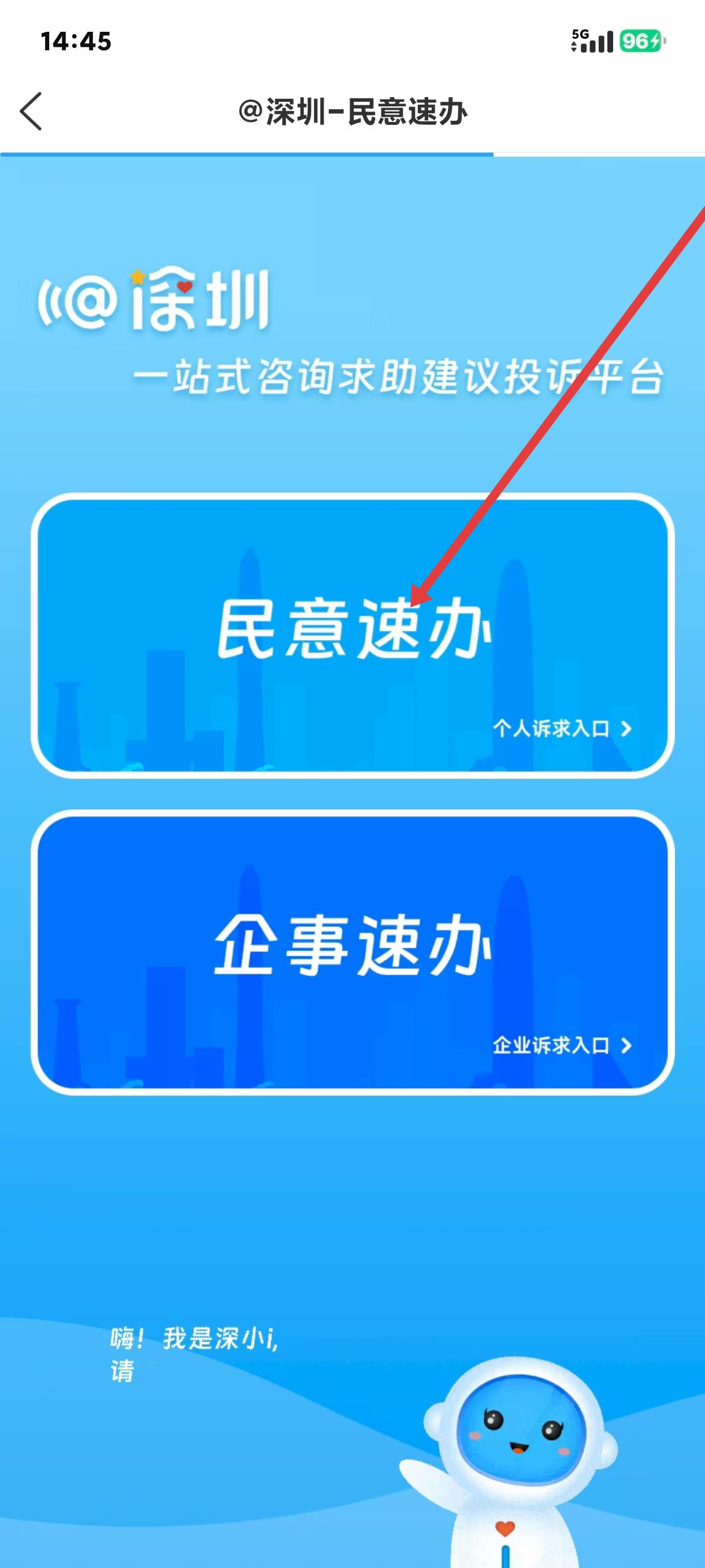 2、民意速辦板塊明確個人與企事速辦入口分列,深小i引導互動,打造一站式咨詢求助平臺,幫助市民和企業快速反饋訴求。