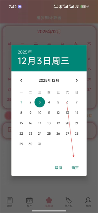 3、根據自身情況選定后點擊確定,可查看當月月經期安全期排卵期分布。
