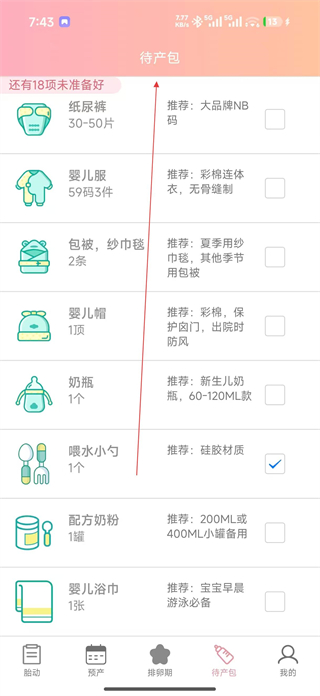 4、進入待產包頁面瀏覽所需物品列表,找到已準備好的物品,點擊對應方框勾選標記,未準備的可參考推薦信息逐步籌備相關物資。