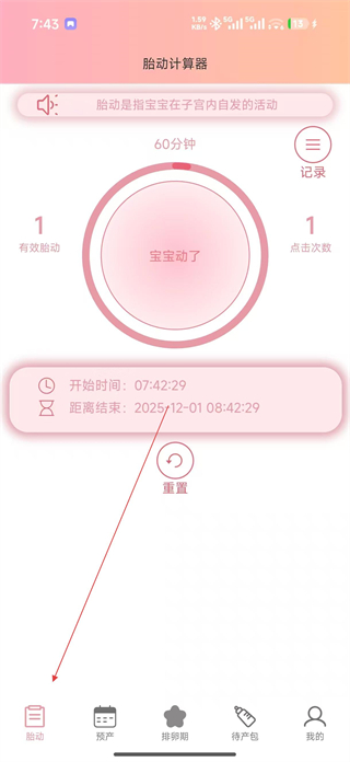 1、打開好孕數胎動,進入胎動頁面點擊寶寶動了按鈕記錄胎動,頁面會顯示有效胎動和點擊次數,掌握胎動情況。