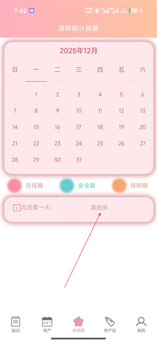 2、切換到排卵期頁面點擊月經第一天后的請選擇按鈕,彈出日歷選擇對應日期。