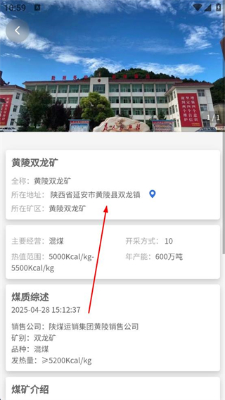 4、進入黃陵雙龍礦詳情頁查看煤礦的所在地主要經營等信息,了解煤質綜述及煤礦介紹,獲取該煤礦的詳細資料。