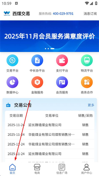 2、進入首頁瀏覽交易平臺中長協平臺等功能入口,查看交易公告列表里的交易信息,了解近期的銷售采購動態。