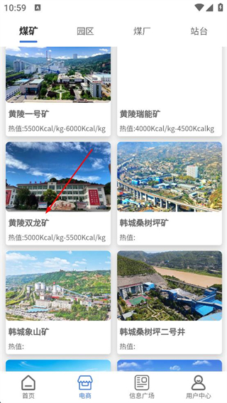 3、進入電商頁面切換煤礦園區等分類,查看黃陵一號礦黃陵雙龍礦等煤礦信息,了解各煤礦的熱值等基礎參數。