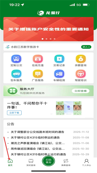 2、首頁有定制公交等功能入口,還有服務大廳和公告板塊,可查公交線路調整等信息,滿足公交出行需求。