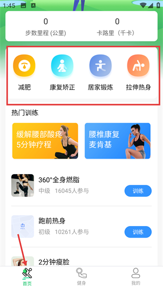 1、首頁提供減肥等訓練分類入口,展示熱門課程,統計步數里程與卡路里,是綜合訓練服務的核心入口。