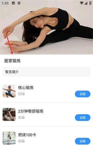 2、居家鍛煉頁面聚焦居家場景課程,含核心鍛煉等初級內容,每個課程配訓練按鈕,方便用戶快速開啟鍛煉。