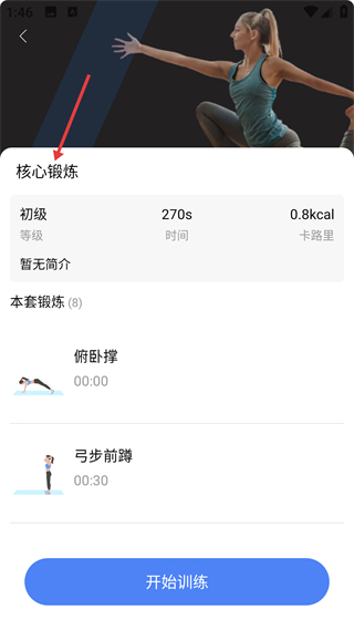 3、核心鍛煉詳情頁展示初級課程信息,時長270秒、耗0.8千卡,列俯臥撐等動作,支持點擊開始訓練啟動課程。