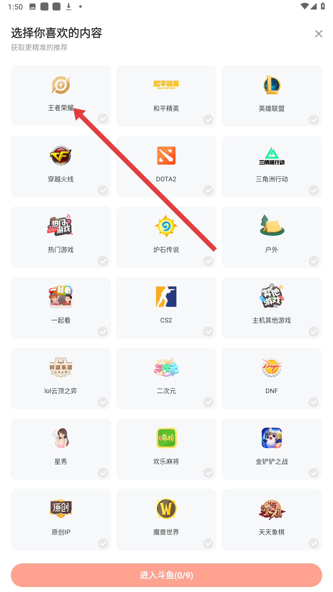 1、進入斗魚APP內容選擇界面,可選擇王者榮耀、和平精英等感興趣的游戲內容,以便獲取更精準的推薦。