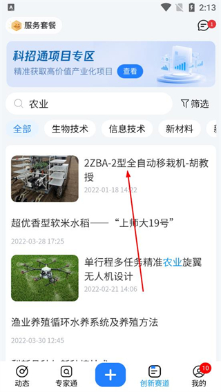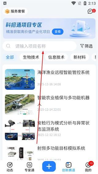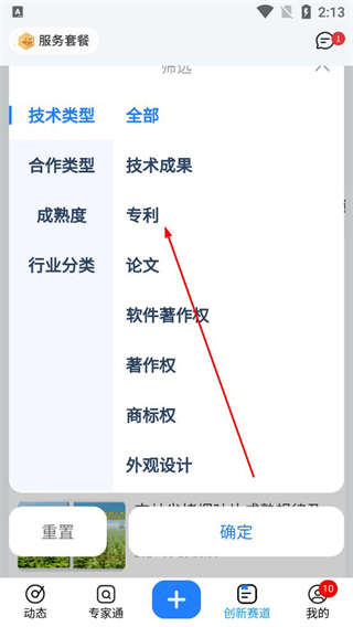 1、打開科企島軟件進入科招通項目專區頁面,點擊篩選按鈕,在彈出的篩選選項中選擇技術成果下的專利類型,點擊確定完成篩選。