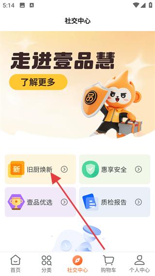 2、在APP底部導航欄,點擊社交中心,進入社交中心頁面,看到舊廚煥新等功能入口,點擊舊廚煥新,進入相關活動頁面。