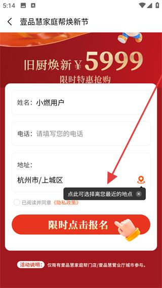 3、進入壹品慧家庭幫煥新節活動頁面,看到舊廚煥新限時特惠搶購活動,填寫姓名、電話等信息,點擊地址選擇區域,準備選擇最近的地點。