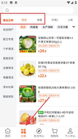 2、點擊應用分類頁面以搜索為引導,按多樣類別陳列商品,從水果到糧油,滿足家庭食材采購需求。
