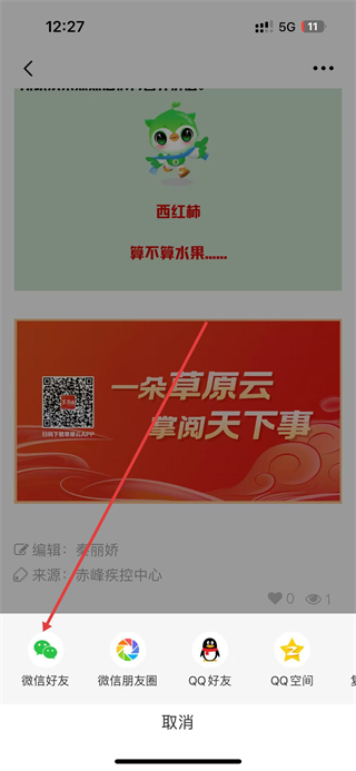 4、在詳情頁找到分享按鈕,點擊后彈出分享選項,選擇想要分享的渠道,即可將該資訊內容分享給對應平臺的好友。