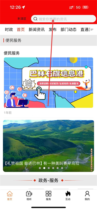 1、打開軟件進入首頁,找到頂部搜索框,點擊搜索框輸入想要查找的資訊關鍵詞,可獲取相關內容,同時可瀏覽首頁展示的便民服務信息。