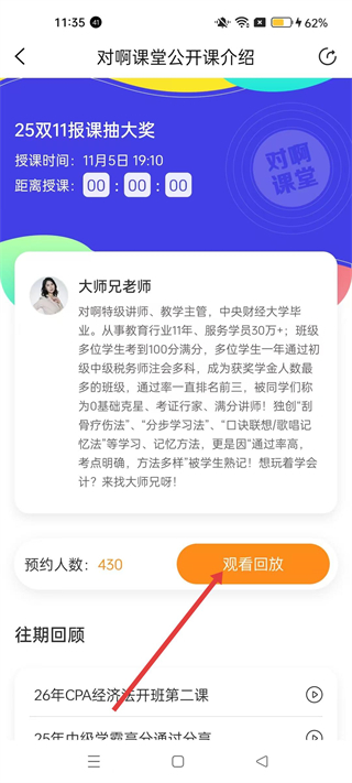 3、進入公開課介紹頁面,可查看授課時間、講師信息等,如大師兄老師的詳細介紹,點擊觀看回放可回顧課程,還能查看往期回顧內容。