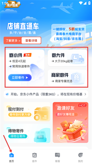 1、首頁可選擇寄小件、寄大件等服務類型,還能切換現付、到付、得物寄件等模式,支持對接多電商平臺,快速進入對應寄件流程。