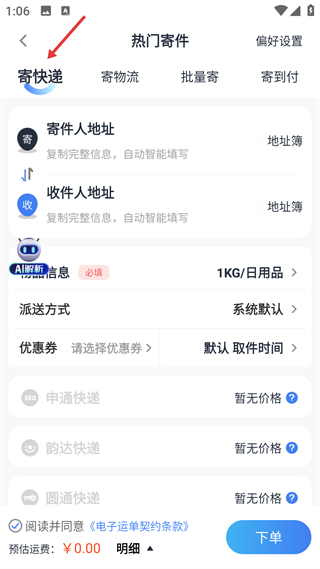 2、寄快遞頁填寫寄收雙方地址,選擇物品信息、派送方式,關聯優惠券,查看不同快遞公司報價后完成下單。