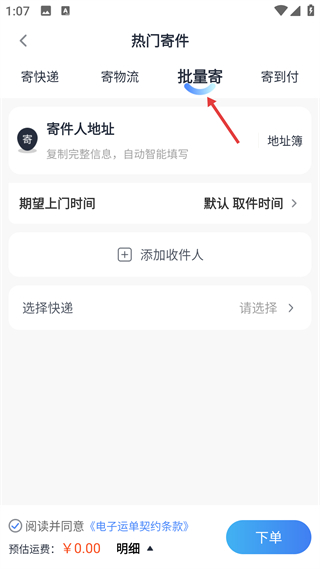 3、批量寄頁適配多收件人場景,填寫寄件人地址后添加收件人,選擇快遞及上門時間,高效完成批量寄件。