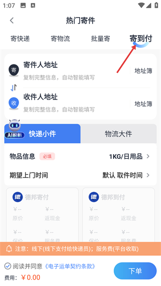 4、寄到付頁分快遞小件與物流大件,填寫地址和物品信息后選到付服務,明確費用說明方便結算。