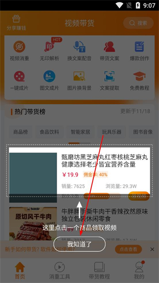 1、進入視頻帶貨軟件首頁,瀏覽分享賺錢板塊的功能入口,查看熱門帶貨榜商品,點擊感興趣的商品卡片,關閉提示彈窗后即可查看商品詳情。