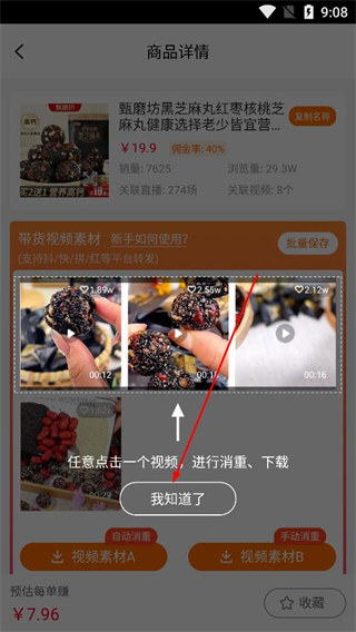 2、進入商品詳情頁面查看商品基本信息與帶貨視頻素材,任意點擊一個視頻,可進行重置或下載。