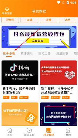 4、進入帶貨教程頁面切換視頻號直播等標簽,點擊獲取抖音運營教程包,查看新手必看板塊的教程內容,學習開通帶貨櫥窗等方法。