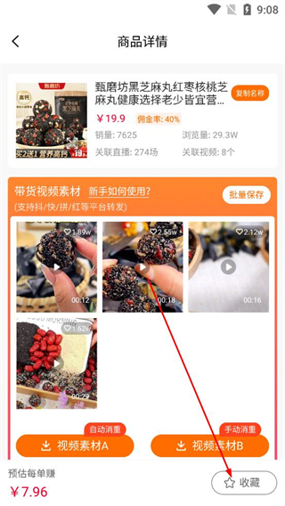 3、在商品詳情頁面確認視頻素材內容后,選擇自動重置或手動重置功能,按需選用視頻素材A或B,點擊收藏按鈕可將該商品加入收藏列表。
